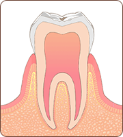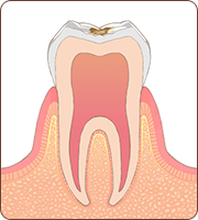 むし歯がエナメル質を溶かし、歯の内部に広がり、象牙質まで進んだ状態です。冷たい飲食物で痛みを感じるようになります。むし歯に侵された部分を除去し、詰め物を行います。